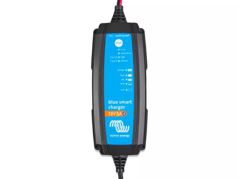 Victron Energy Blue Smart IP65 akkulaturi. Sisäänrakennettu Bluetooth: laturin ja akun tila on mahdollista tarkistaa langattomasti älypuhelimella, tabletilla tai muulla mobiililaitteella. Laturin asetukset myös asetettavissa langattomasti VictronConnect App -sovelluksella. 7-vaiheinen latausalgoritmi hyödyntää akun ominaisuudet ja suorituskyvyn maksimaalisesti, tuottaa akun tarvitseman latausvirran, ylläpitää akun kunnon, varmistaa paremman suorituskyvyn, pidentää käyttöikää. Syväpurkautuneiden akkujen palautus: pyrkii lataamaan syväpuretun akun pakkosyöttämällä siihen matalaa latausvirtaa ja siirtyy normaaliin latausvirtaan heti kun akkunapojen yli mitataan riittävän suuri napajännite. Automaattinen latausvirran lämpötilakompensointi. Voidaan käyttää myös jännitelähteenä, Power supply -toiminto vakauttaa syötön poistamalla latausohjelmat käytöstä. Helppo liitäntä: toimitukseen sisältyy hauenleuka- ja rengasliittimet (M8), 12V, hyötysuhde 94%, tehonkulutus valmiustilassa 0.5W, latausvirta: 5A, suojaukset: vääränapainen kytkentä - ulostulon oikosulku - ylikuumeneminen, käyttölämpötila -40°C ... +60°C – RH max 95%, akkukaapelit 1.5m, virtajohto 1.5m sukopistokkeella (CEE 7/17).