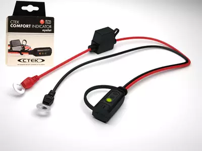 Akun varaustason ilmaisin. Yhteensopiva CTEK-latureiden kanssa. Ilmaisin kytketään akun ja laturin väliin jolloin ilmaisin näyttää akun varaustilan. Ilmaisimessa vesitiivis liitin suojahatulla, joten se voidaan jättää akkuun kiinni vaikka laturi irroitettaisiin.. Johdon pituus 50mm.