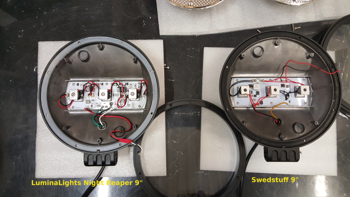 Kaikista merkittävimmät erot löytyvät kuitenkin heijastimen alta. Kilpailijan elektroniikassa ja ledeissä on säästetty huomattavasti verrattuna LuminaLightsiin. Kilpailijan lisävalossa ledien ohjaus- ja suojaelektroniikkaan on käytetty vain murto-osa LuminaLightsien komponenttimäärästä.