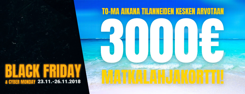 Kaikkien Black Friday-kampanjan (22.-26.11.2018) aikana tilanneiden kesken arvotaan 3000€ matkalahjakortti!