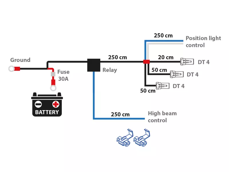 4-nap. DT Deutsch kytkentäsarja kolmelle parkilliselle lisävalolle, 4mm² syöttöjohdot, 4-nap. 12V 40A rele, roiskevesitiivis sulakerasia + sulake 30A