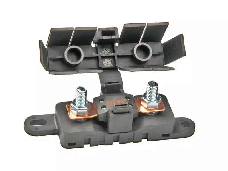 Sulakerasia Mega Flex. MEGA® Flex Series 32V pulttikiinnitteinen sulakepidin, yksinkertainen sulakkeen asennus, musta UL 94 V-0 -hyväksytty taipuisa kansi: mahdollistaa kaapelivedon kuudelta eri kohdalta ja paksut johdot sekä niputetut rengasliittimet, johtokoko: 8-35mm², useita sulakepitimiä voi yhdistää toisiinsa: kyljissä kiinnitysurat, ruostumattomat M8 pultit, kuusiomutterit ja aluslevyt, sulake ei sis. toimitukseen, käyttölämpötila-alue: -40°C ... +105°C