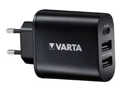 Varta USB-verkkovirtapistoke. 3 rasiaa: 2 x USB-A (5V – 2.4A) + 1 x USB-C (5V – 3.0A), lataa kolmea laitetta yhtä aikaa, viimeisintä USB-C teknologiaa. Max 27W, syöttöjännite 100-240V – 50-60Hz