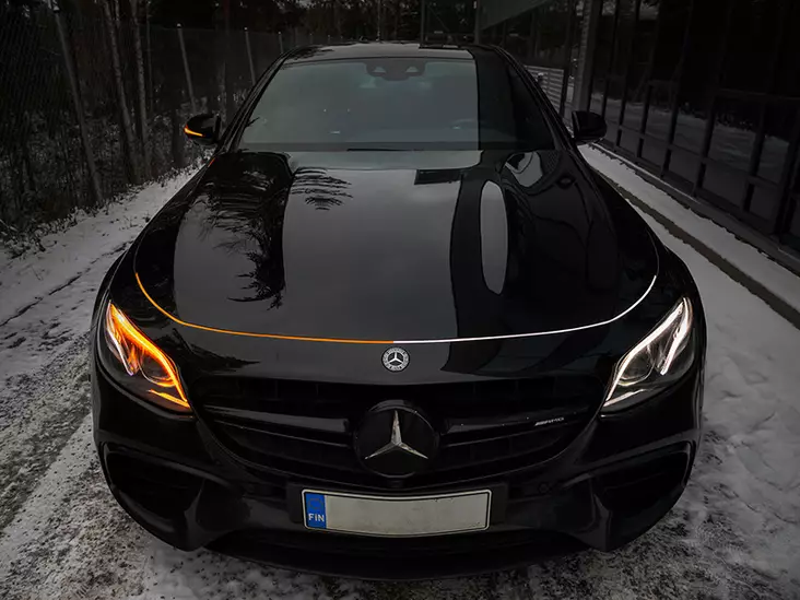 Näyttävä kaksivärinen valkoinen valonauha konepellin etureunaan, jossa oranssi vilkkumoodi, dynaaminen sytytys, mahdollisuus lyhentää pituus sopivaksi muutaman sentin välein, sytytyksen aloituskohta säädettävissä oikeaan kohtaan, tarrakiinnitys, pituus 180cm, jännite 11-15V