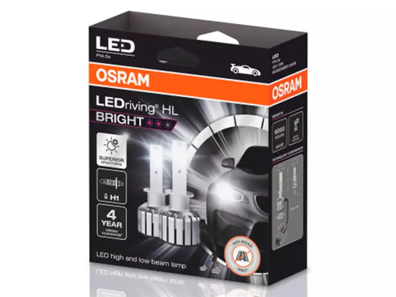 Osram LEDriving® HL BRIGHT H1 LED-polttimopari. Värilämpötilaltaan viileä valkoinen, Off-road: Ei tieliikenteeseen, EI ECE–hyväksyntää.
