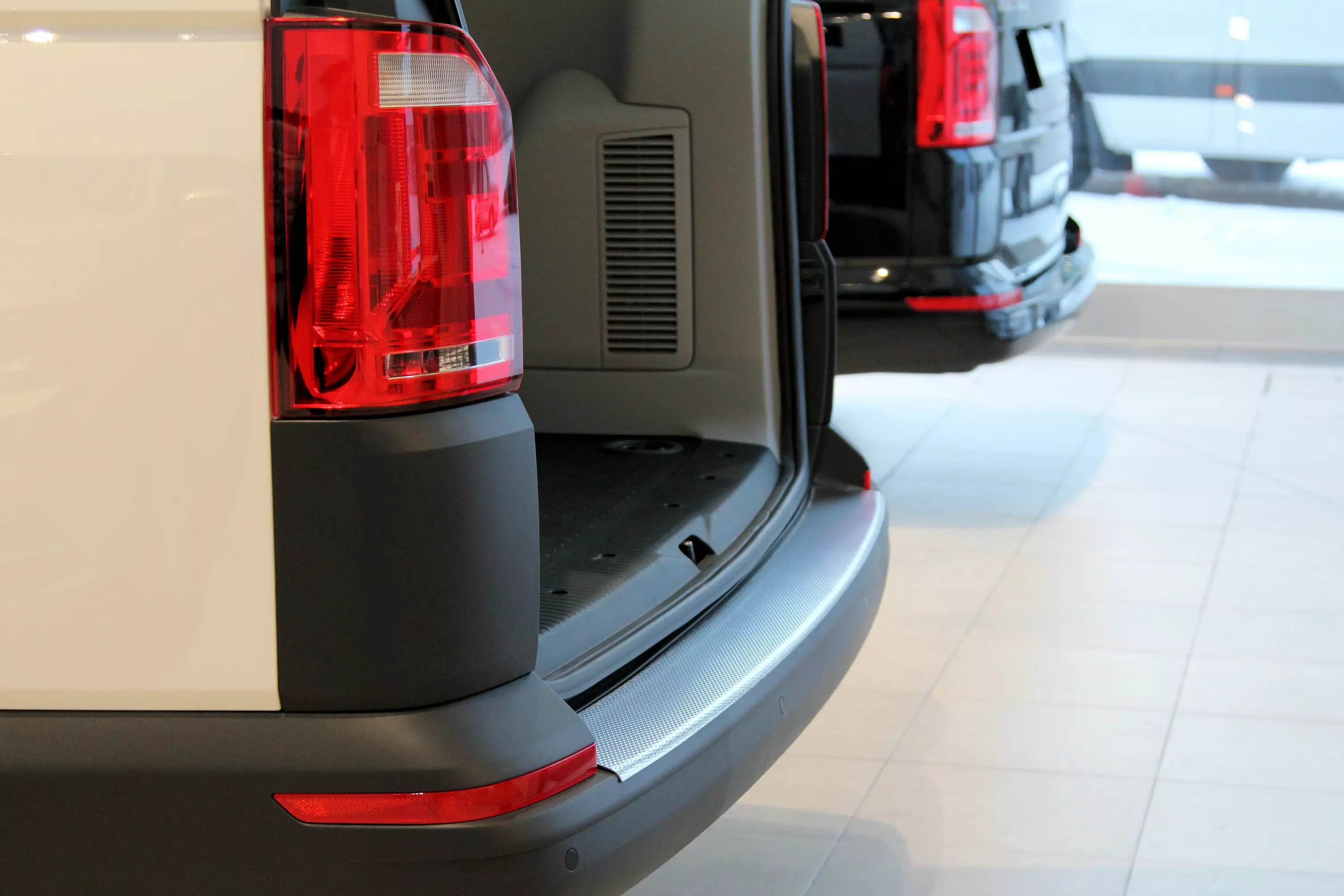 Metecin valmistama takapuskurin suojalevy nosto-ovellisiin Volkswagen Transporter T6 2015-2019 pakettiautoihin. Erinomainen suoja takapuskurille kun autoon lastataan tavara.