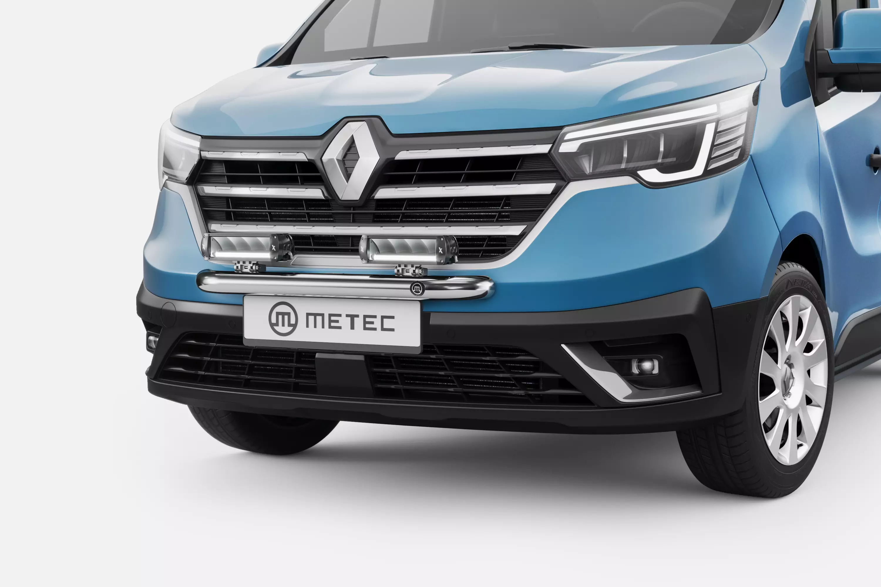 Ruostumattomasta teräksestä valmistettu lisävaloteline Renault Trafic 2022- pakettiautoihin. Putken halkaisija 60mm. Valmiit paikat kolmelle lisävalolle. Suunniteltu mallikohtaisesti, joten istuvuus on 100%.