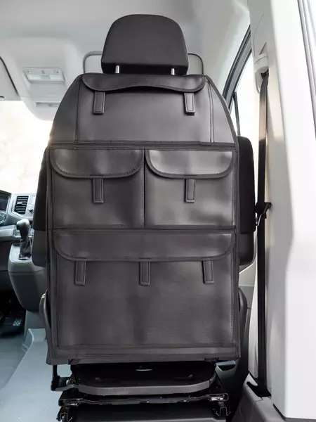 5-taskuinen järjestelymatto kiinnitetään kuljettajan ja matkustajan istuinten taakse. Kiinnitys käy helposti silmukoiden ja neljän joustavan nauhan avulla. Tyylikäs ja käytännöllinen säilytysratkaisu.