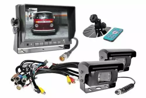 S-Vision Peruutuskamerajärjestelmä 7" näytöllä sekä kahdella moottoriläpällisellä kameralla.