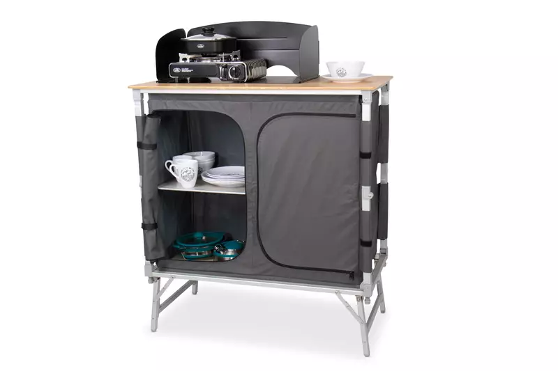 Kokoontaitettava retkikeittiö on käyttövalmis sekunneissa helpon pystytysjärjestelmän ansiosta. Keittiössä on bambuinen työtaso, kevyt alumiinirunko, kestävistä MDF-levyistä valmistetut hyllyt sekä tuulisuoja.